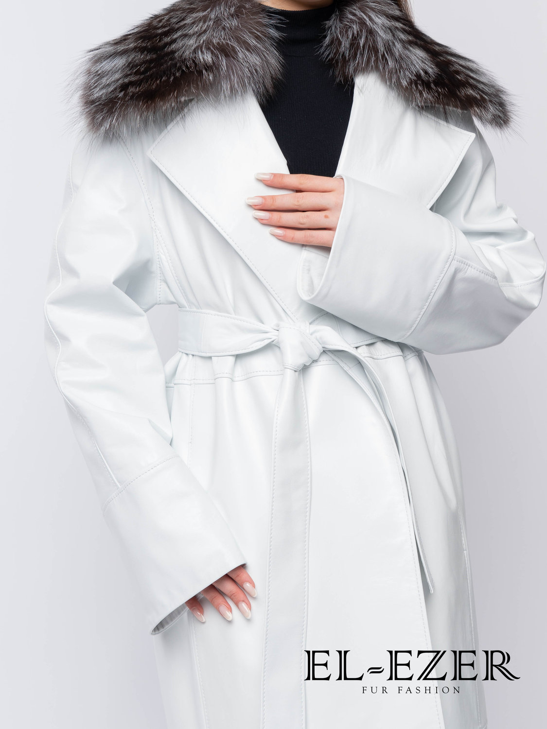 Ключевым акцентом изделия является эффектный воротник, отделанный натуральной чернобуркой. Пышный, густой мех с характерным контрастным окрасом придаёт образу глубину и выразительность, создавая гармоничное сочетание гладкой кожи и объёмной меховой фактуры. Чернобурка добавляет плащу роскошный характер и усиливает визуальное впечатление. Воротник съёмный, что позволяет трансформировать образ в зависимости от сезона и настроения — от роскошного зимнего варианта до лаконичного демисезонного.