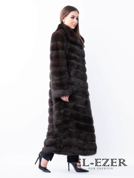 Элегантная шуба выполнена из отборного баргузинского соболя — одного из самых ценных и благородных видов натурального меха. Насыщенный тёмно-коричневый оттенок с природным переливом, шелковистая ость и густая подпушь создают глубокую фактуру и выразительный, по-настоящему роскошный внешний вид. Мех отличается высокой плотностью и мягкостью, обеспечивая комфорт и тепло даже в суровые зимние дни.